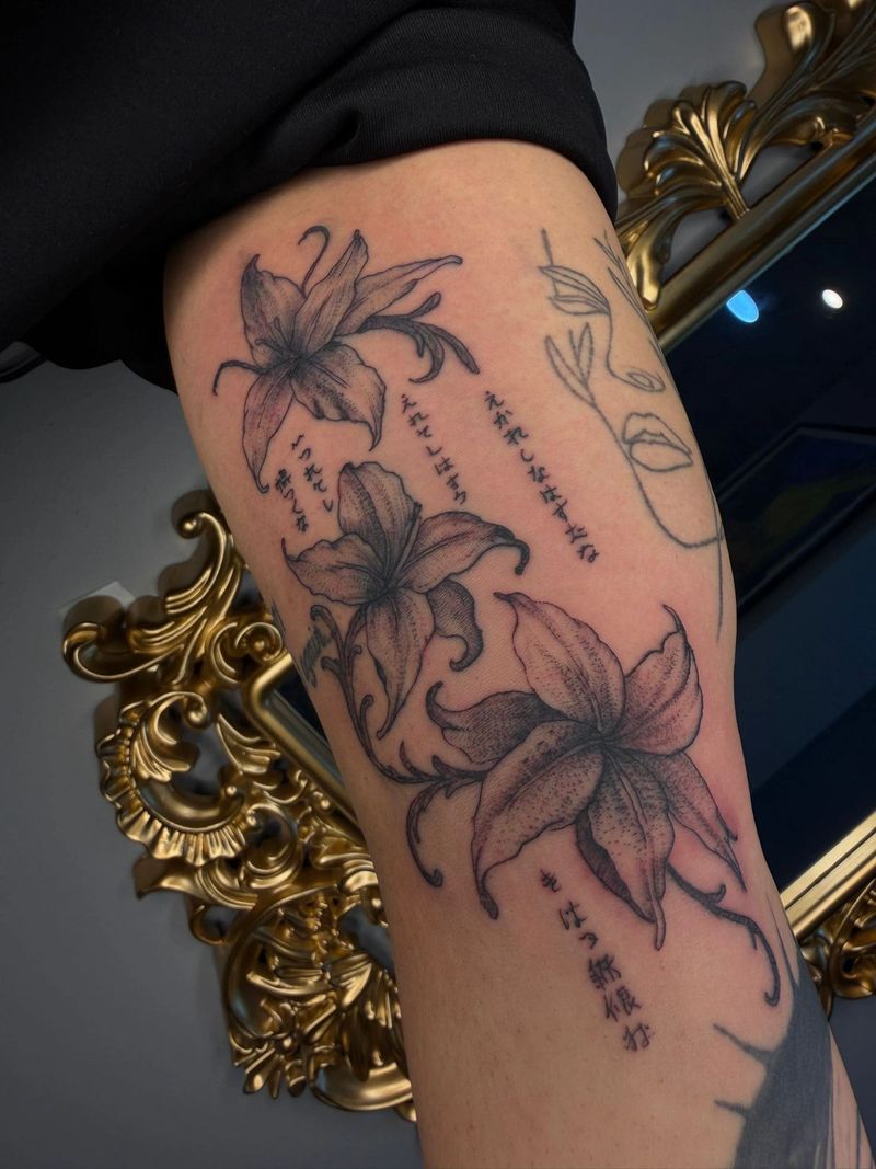 Kullanıcının kolunun üst kısmında yer alan bu dövme, gerçekçi lilyum çiçekleri ve aralarına serpiştirilmiş el yazısı detaylarından oluşur. Çiçeklerin dokusu ve çizgilerin inceliği ön plana çıkmaktadır.