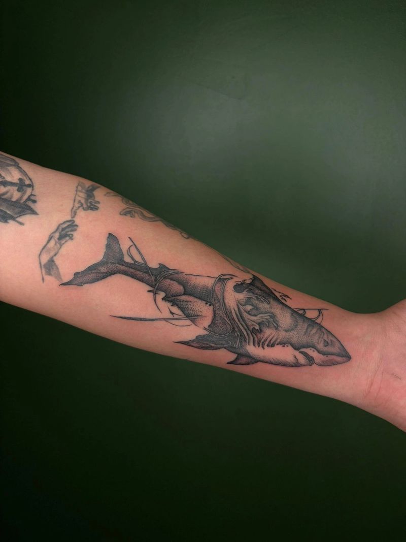Kullanıcının kolunda bulunan bu dövme, dinamik bir köpek balığı figürünü ve onu çevreleyen sanatsal, çizgi odaklı detayları içerir. Sanatçının hareket ve form konusundaki başarısını göstermektedir.