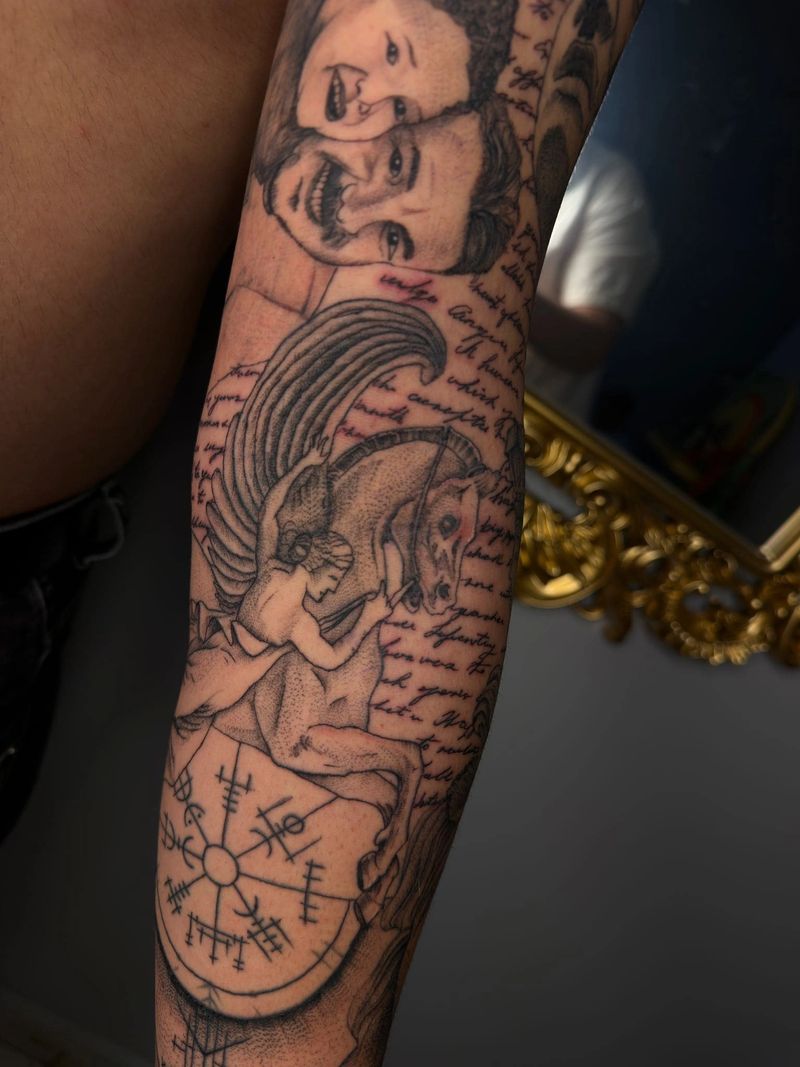 Kullanıcının kolunda yer alan bu dövmede, kanatlı bir figür, karmaşık el yazısı ve antik semboller yer almaktadır. Sanatçının mitolojik ve sembolik öğeleri işleme konusundaki başarısını sergilemektedir.