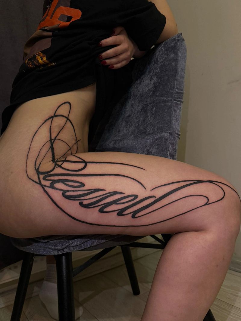 Kullanıcının bacağında bulunan bu dövme, kaligrafik yazı sanatının (baba calligraffiti) dinamik ve akıcı bir örneğidir. "Blessed" kelimesi, modern ve şık bir tarzda işlenmiştir. Sanatçının tipografi ve hareket konusundaki yeteneğini vurgulamaktadır.